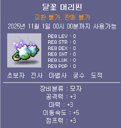 달나라의아기 월묘로부터 이벤트 퀘스트를 진행하실 수 있습니다.퀘스트 진행 조건 보상 달은 어떻게 생겼나요 레벨 30 이상 ~ 200 이하 📌달꽃 머리핀 (11월 1일 00시까지 사용 가능) - 달꽃 머리핀 (11월 1일 00시까지 사용 가능)