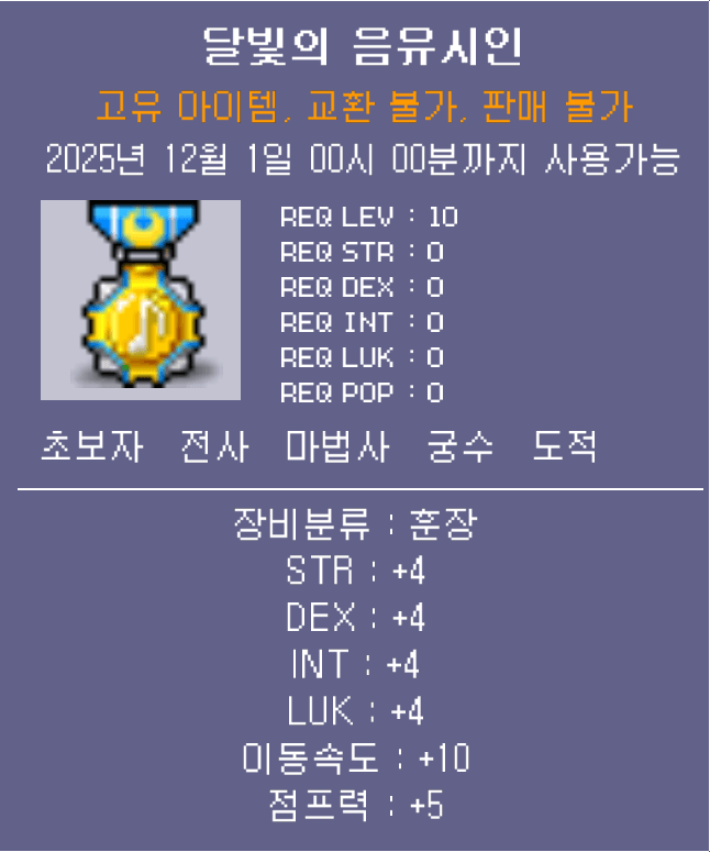 달나라의할아버지 월묘로부터 도전을 진행하실 수 있습니다.완료 조건 보상 달빛소나타의 행방 완료 후 달빛도둑 퇴치 10회 진행 🎖️달빛의 음유시인 (12월 1일 00시까지 사용 가능) - 달빛의 음유시인 (12월 1일 00시 00분까지 개봉 가능)