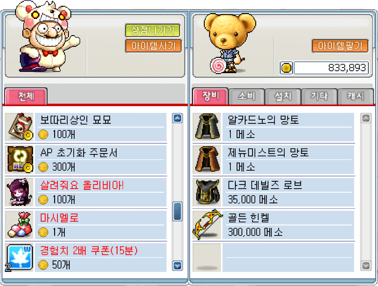 월드 보스 레이드 입구의 슈피겔만을 통해 월드 보스 레이드 코인 상점을 이용하실 수 있습니다.아이템 선택 슬롯 4칸 확장권 (교환 불가, 구입 후 30일간 사용 가능) (2개까지만 구매 가능) 호신부적 2개 (교환 불가, 기간 제한 없음) (2세트까지만 구매 가능) 보따리상인 묘묘 (교환 불가, 구입 후 30일간 사용 가능) (5개까지만 구매 가능) AP 초기화 주문서 (교환 불가, 구입 후 30일간 사용 가능) (1개까지만 구매 가능) 살려줘요 올리비아! (교환 불가, 기간 제한 없음) (1개까지만 구매 가능) 마시멜로 (교환 불가, 기간 제한 없음) (1000개까지만 구매 가능) 경험치 2배 쿠폰(15분) 2개 (교환 불가, 구입 후 7일간 사용 가능) (5세트까지만 구매 가능, 매 7일마다 초기화) 쿠키(2개) (교환 불가, 구입 후 7일간 사용 가능) (5세트까지만 구매 가능, 매 7일마다 초기화)