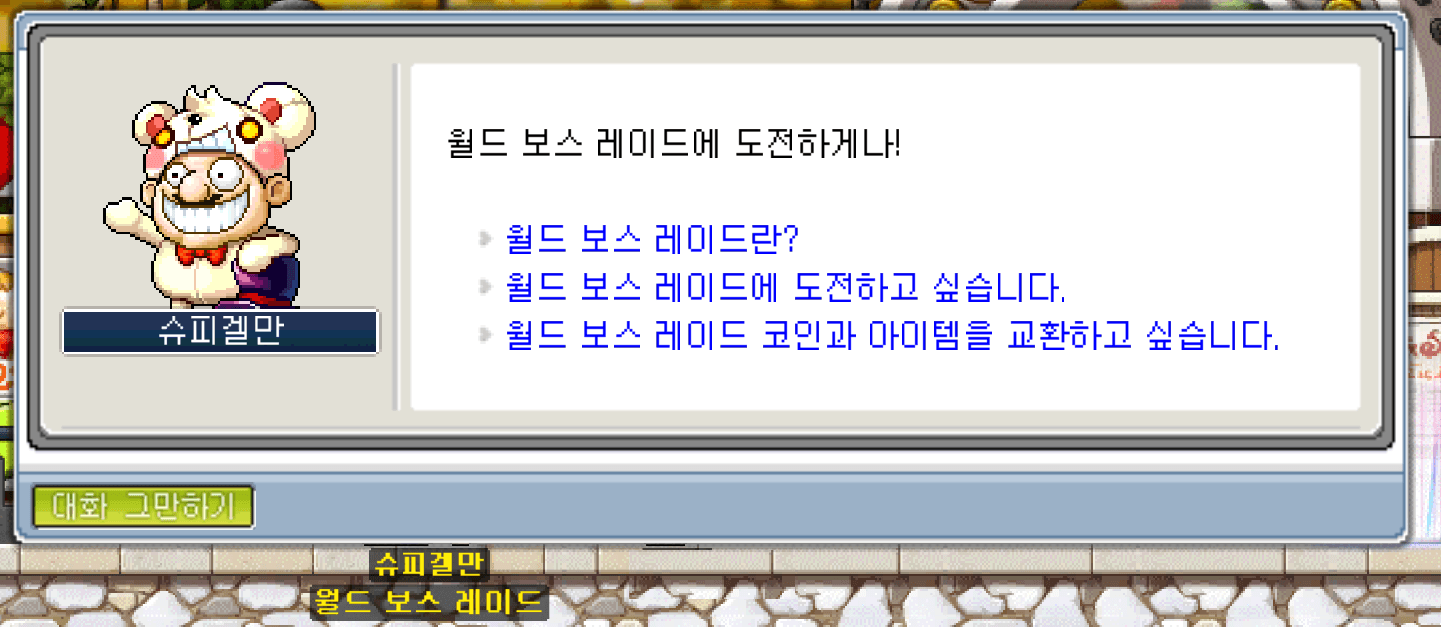 메이플 운영자를 통해월드 보스 레이드 입구로 진입하실 수 있습니다. 월드 보스 레이드 입구에서슈피겔만과의 대화를 통해 월드 보스 레이드에 도전하실 수 있습니다.진행 조건 반복 입장 조건 제한 시간 단계 구성 보상 레벨 30 이상 ~ 200 이하 - 1. 3인 이상, 6인 이하의 파티 2. 파티 내 최대 레벨 차 30 이하 or 모든 파티원의 레벨 100 이상 60분 총 28단계 🎫월드 보스 레이드 코인 교환권 (단계벌 차등 지급) <슈피겔만의 부탁 2> 퀘스트 수령 필요- 월드 보스 레이드 코인 교환권 (설치 아이템)