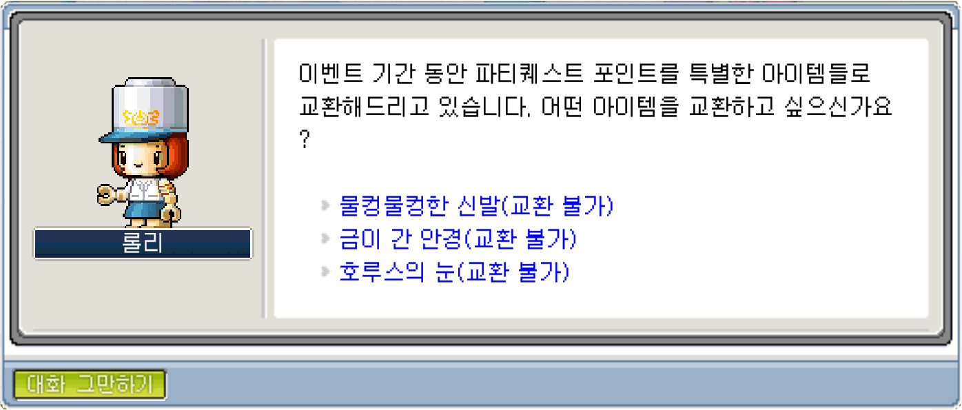 롤리를 통해 파티퀘스트 포인트를 파티퀘스트 장비 아이템들로 교환할 수 있습니다.아이템 물컹물컹한 신발 (교환 불가) 🪙50 포인트 금이 간 안경 (교환 불가) 🪙200 포인트 호루스의 눈 (교환 불가) 🪙250 포인트 - 물컹물컹한 신발 (교환 불가)